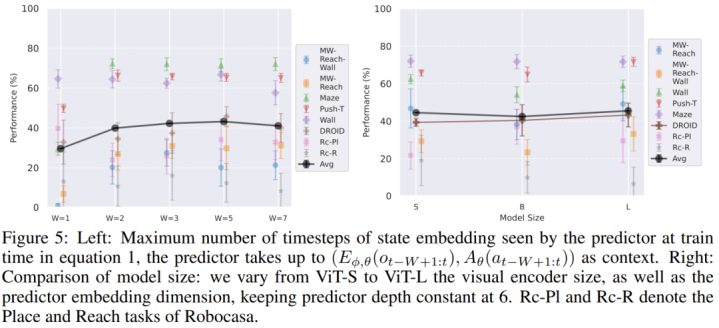 模型规模:这是一个令人意外的发现:在简单的模拟环境(如Maze,Wall)中,增大模型规模(从ViT-S到ViT-L)非但没有帮助,反而可能由于嵌入空间过于复杂而导致规划效率下降。但对于复杂的现实数据(DROID),大容量的编码器和更深的预测器则展现出了明确的正相关收益,说明任务的物理复杂度决定了智能体所需的智力上限。