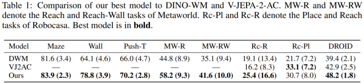 在与DINO-WM和V-JEPA-2-AC的直接较量中,该模型在几乎所有维度上均取得了领先。