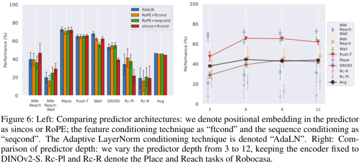研究最终汇总所有洞察,提出了针对不同任务的最优配置:在模拟器中使用ViT-S配以AdaLN,而在真实复杂场景中使用DINOv3ViT-L配以12层深度的预测器。
