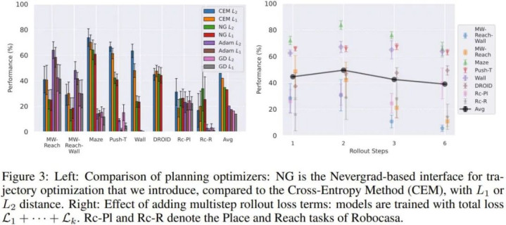 多步损失的对齐作用:在训练中加入2步展开损失能显著改善预测器的长时稳定性,使其训练任务与测试时的递归规划任务更加对齐。对于最复杂的DROID任务,最佳的展开步数甚至需要达到6步。