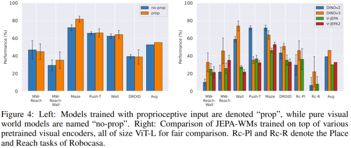 编码器架构:DINO系列编码器(DINOv2/v3)在所有任务中均表现出对V-JEPA等视频编码器的明显优势。这归功于DINO强大的细粒度目标分割能力,这对于需要精确感知物体位置的操纵和导航任务至关重要。在视觉复杂度更高的真实数据(DROID)中,DINOv3的优势进一步扩大。